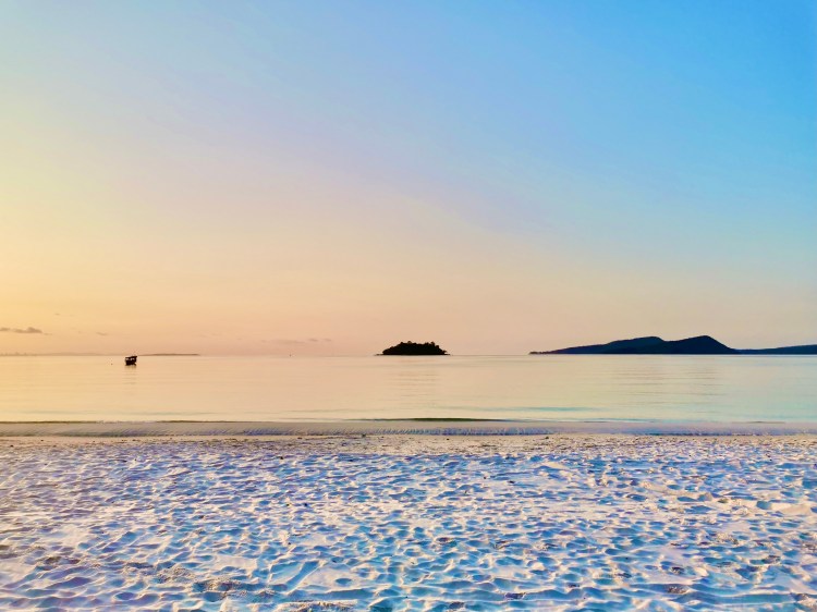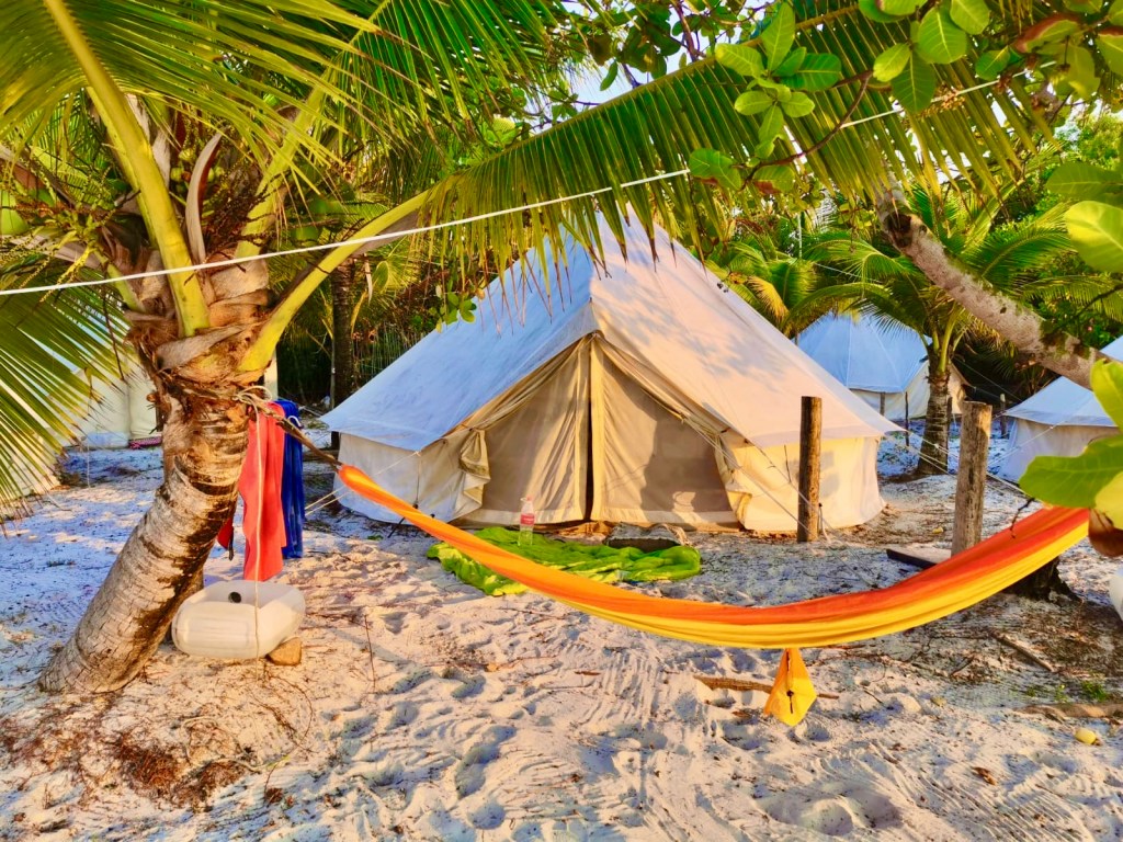 « 3$/nuit pour une tente sur le sable avec vue sur mer. À 8h00 plus d’électricité car le générateur à gasoil est coupé. Le ventilateur s’éteint. On cuit sous la tente. On se lève, marche 5 mètres sur le sable blanc qui sépare les tentes de l’océan turquoise. Premier bain du jour, 33°. On est au bon endroit »