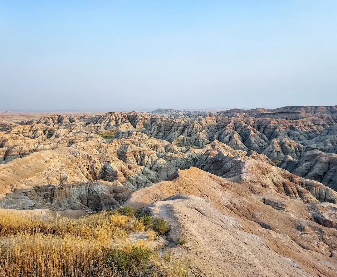 L’aventure de Nathalie et de Romain à travers les grands parcs continue jusqu’au parc national des Badlands, nom donné par les premiers colons français durant l’époque de la Louisiane française ! D’après Nathalie : « Il y a un vent à t’arracher la tête. Et aucun abri en vue pour te cacher ! Ajoutez à cela, une chaleur intenable. Et encore, pas de quoi se plaindre, nous avons notre grosse voiture américaine ! On peut rouler d’un point de vue ouf à l’autre. De là, on court dehors, clic clic clic, 3, 4 photos et on revient en courant se mettre à l’abri. Mais imaginez-vous à l’époque dans leurs petits chariots à la Laura Ingalls, sans clim, ou à dos de cheval … ils devaient penser être arrivés en enfer. Donc les premiers colons se dépêchaient de traverser cet endroit pour aller cultiver leurs potagers au calme dans les grandes plaines.«